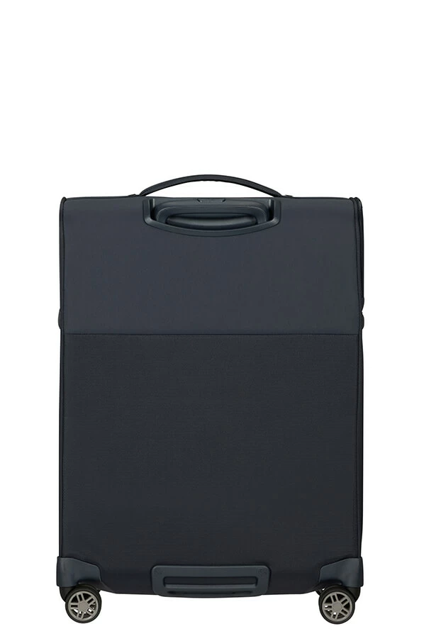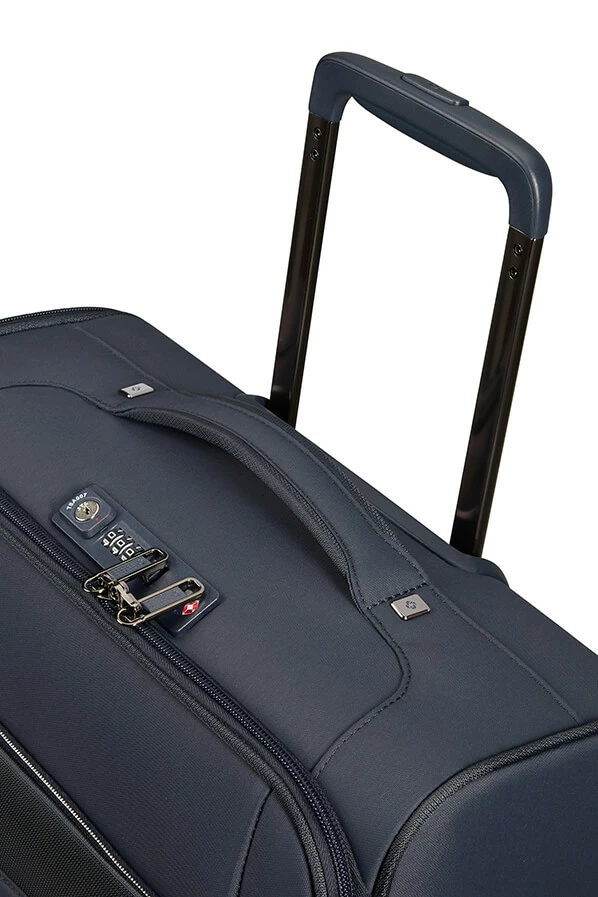 Maleta tipo trolley blanda de Samsonite y colección Airea cuenta con sistema integrado de 4 ruedas, cierre con combinación con función TSA y dos bolsillos exteriores con cremallera. Asa de remolque de dos tubos. Compartimento superior con divisor de malla y bolsillo con cremallera, correas para ropa en el compartimento inferior. El color del trolley es azul.