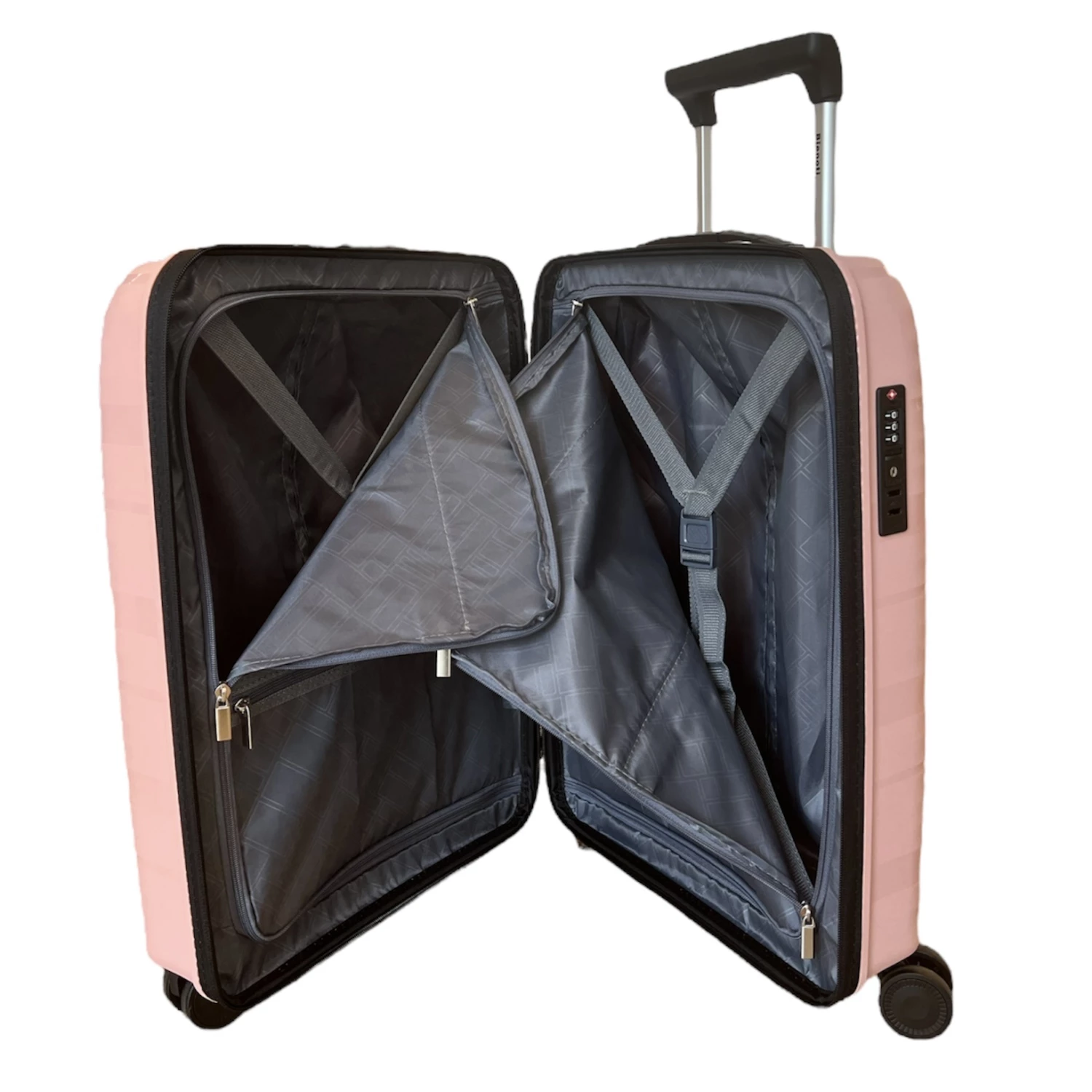 Maleta de tamaño grande ,para viajes grandes viajes. Fabricada en robusto polipropileno. Dispone de 4 ruedas dobles , que giran con total suavidad. Cierra con cremallera y cierre con combinacion de 3 dígitos y cerradura TSA. En el interior, ambos lados cierran con bandeja separador de cremallera y en el interior disponen de cintas cruzadas para ajustar el equipaje. Su cremallera se expande para consegir capacidad extra de 7 kg mas.. Color Rosa claro