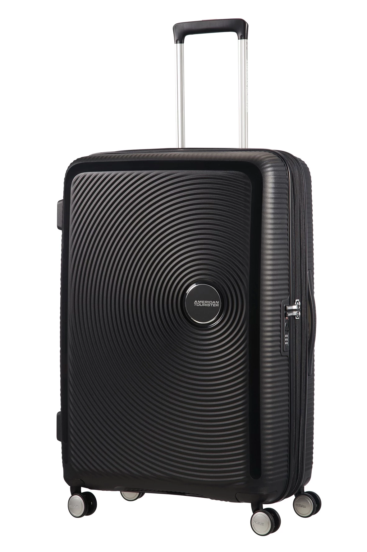 Trolley grande en color negro de la marca American Tourister. El trolley está fabricado en resistente polipropileno. Dispone de 4 ruedas dobles para un cómodo transporte. Apertura a la mitad con cremallera, un lado cierra con bandeja separadora con cremallera y en el otro lado contiene cintas elásticas. Tiene cerradura con combinación de 3 dígitos con función TSA encastrada en la carcasa rígida.