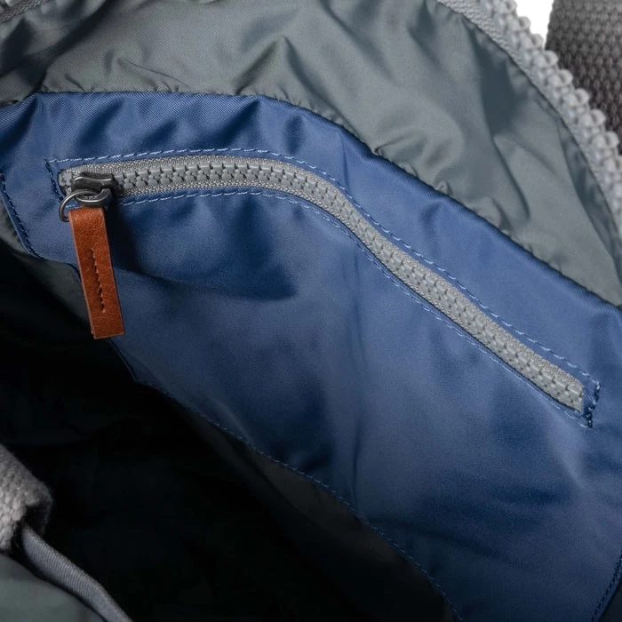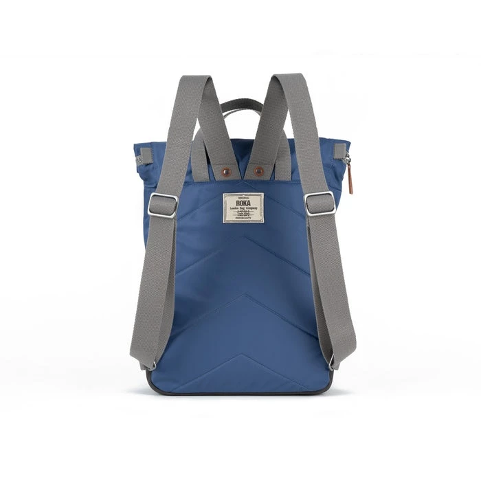 Mochila de la marca Roka London, modelo Canfield B. Tamaño pequeño con medidas 32 cm x 23,5 x 9,6 cm. Confeccionado con materiales reciclados (PET), y aptas para veganos.